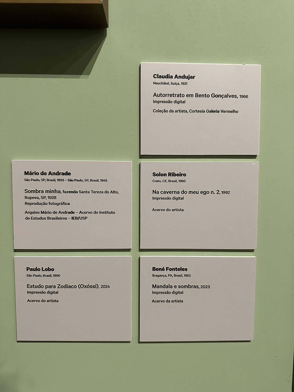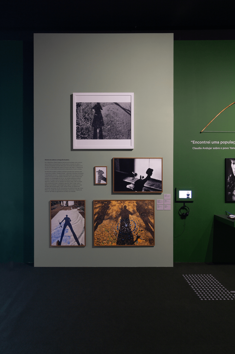 Uma história de sombras na fotografia brasileira atravessa gerações que operaram pela imaginação simbólica. Claudia Andujar projeta sua sombra sobre um tapete de folhas caídas de árvores em clara alusão à floresta com a qual se funde com uma unidade viva, desapegada do seu eu. Essa Andujar adota a filosofia da existência dos Yanomami. Já a sombra platônica de Bené Fonteles se integra à terra vermelha de Brasília, avizinhada por uma lagartixa – o artista é um ser mimético do mundo. Paulo Lobo se projeta como sombra de Oxóssi – o fotógrafo, segundo Villém Flusser caça o objeto de sua câmera. Numa imagem, Mario de Andrade registrou a projeção de seu corpo sobre o chão – Sombra minha – que denota seu conhecido narcisismo. Por fim, Solon Ribeiro, ex-curador de cinema do Pompidou, está aqui com “Na Caverna da Sombra do meu Ego” que entrecruza a Alegoria da Caverna de Platão ao egocentrismo de Mario de Andrade.